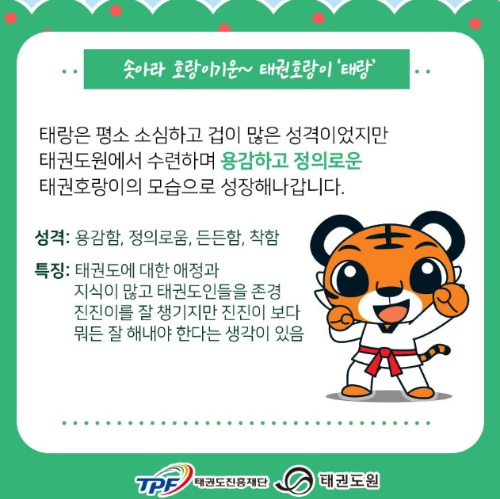 이름 ‘태랑이’는 태권도의 ‘태’와 밝고 기운찬 이미지를 담은 ‘랑이’를 합쳐서 만들어졌습니다. 이는 태권도를 통해 희망과 에너지를 전달한다는 의미를 담고 있습니다. - 역할